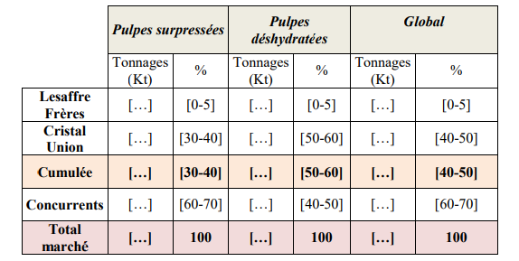 63. En envisageant une segmentation du marché selon le type de pulpes de betteraves, la nouvelle entité détiendra une part de marché cumulée d’environ [30-40] % avec un incrément associé à l’opération [de 0-2] point sur le marché français des pulpes de betteraves surpressées. Sa part de marché atteint [50-60] % avec un incrément associé à l’opération inférieure à [0-5] points sur le marché français des pulpes de betteraves déshydratées.