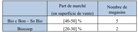 38. Sa part de marché, calculée en surfaces de vente, est de [50-60] %. L’Autorité relève l’existence de quatre enseignes concurrentes : Biocoop, Les Comptoirs de la bio, La Vie Claire et Naturalia.