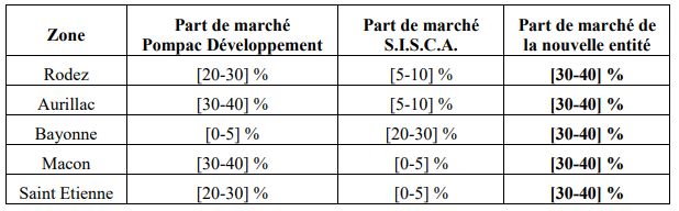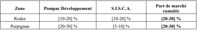 48. Au niveau local, l’analyse concurrentielle a été réalisée dans un rayon de 40 kilomètres à partir des agences de Pompac Développement. Les parts de marché ont été estimées par la partie notifiante sur la base d’études publiques25 et des chiffres d’affaires réalisées par chacune de leur agence dans les zones locales où leurs activités se chevauchent.