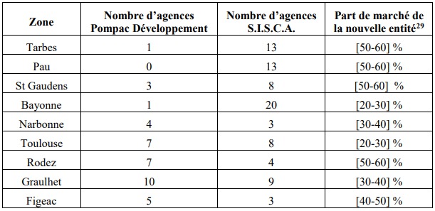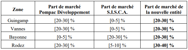 69. Pour ces quatre zones, il convient de relever que trois d’entre elles voient leur structure concurrentielle locale marginalement modifiée dans la mesure où le chevauchement d’activité entre les parties y est très limité, inférieur à [0-5] points. Ainsi, dans les zones de Guingamp, de Vannes et de Bayonne, le pouvoir de marché de la nouvelle entité n’y est pas renforcé, d’autant que sa position reste inférieure à 40 % avec l’existence de nombreuses agences concurrentes mentionnées ci-avant.