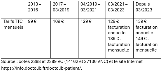 37. En 2019, le service de prise de rendez-vous médicaux en ligne proposé par Docavenue était facturé 49 euros TTC par mois aux professionnels de santé et le service de téléconsultation 59 euros TTC par mois53.