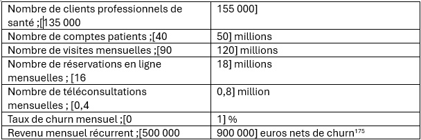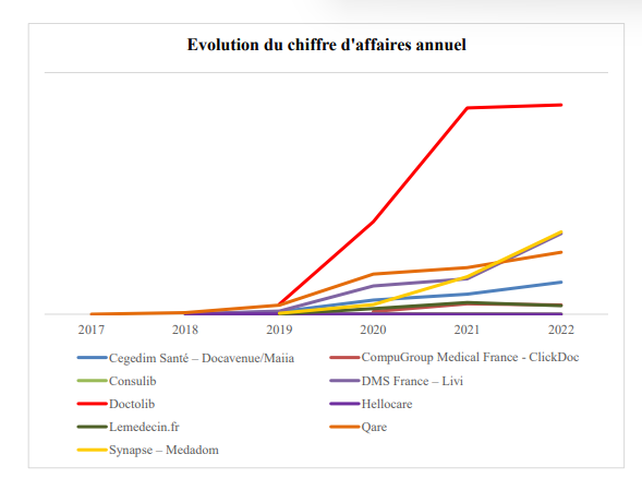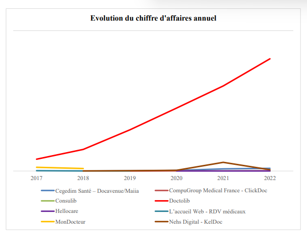 40. En 2023, Doctolib a réalisé un chiffre d’affaires mondial consolidé d’environ [confidentiel] millions d’euros, dont environ [confidentiel] millions d’euros réalisés en France56. En 2024, son chiffre d’affaires mondial est, selon certaines sources, supérieur à 300 millions d’euros57.