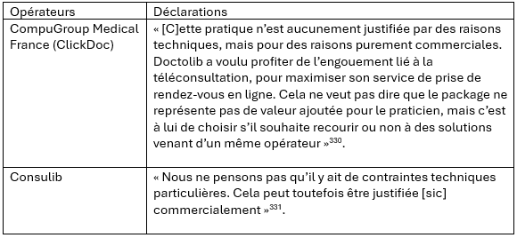 26. Les entreprises de télésecrétariat peuvent également proposer des services tels que la mise à disposition d’un agenda ou la prise de rendez-vous médicaux en ligne lorsque le professionnel de santé recourant à leur service n’en dispose pas, ou encore la gestion d’agenda quelle que soit la solution choisie par le client42. Pour ce faire, elles peuvent utiliser les solutions qu’elles auront elles-mêmes conçues ou recourir à une synchronisation technique avec les services d’agenda ou de prise de rendez-vous médicaux en ligne d’opérateurs externes. Certaines entreprises ont également noué des accords ou partenariats, prévoyant parfois des apports réciproques de clientèle, avec des opérateurs proposant un service de prise de rendez-vous médicaux en ligne tels que Doctolib ou Maiia43.
