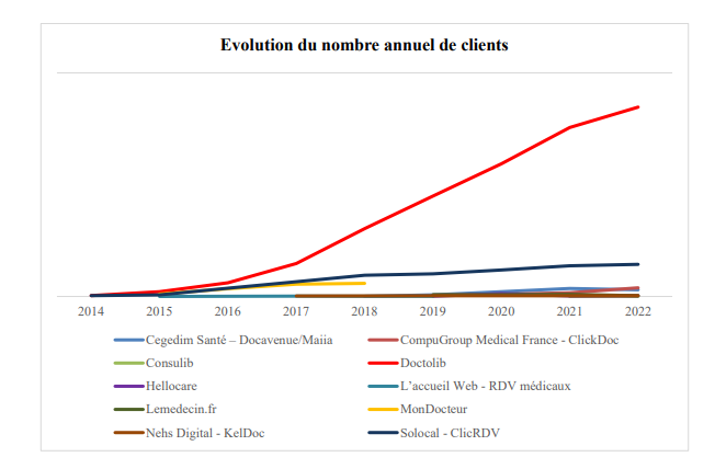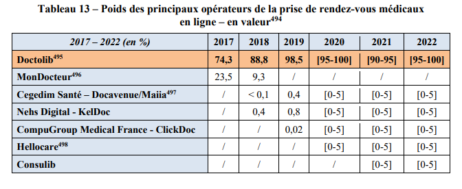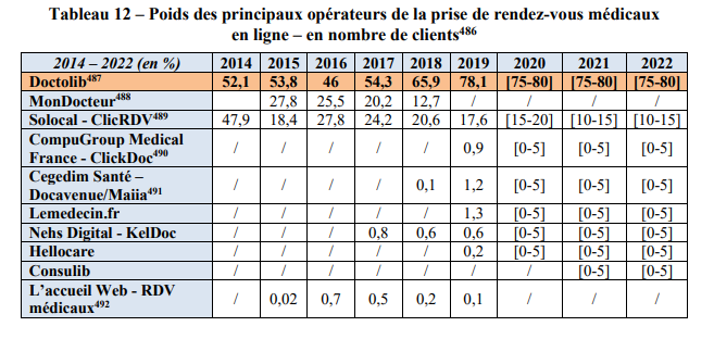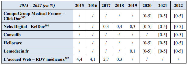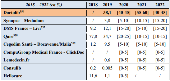 708 Pour rappel, les données transmises correspondent à des estimations, accompagnées de réserves au regard du niveau d’information limité de Doctolib. Ces données correspondent à des estimations fournies par Doctolib, entreprise ayant racheté MonDocteur en 2018. Cotes 11655 et 11656.