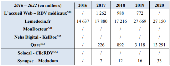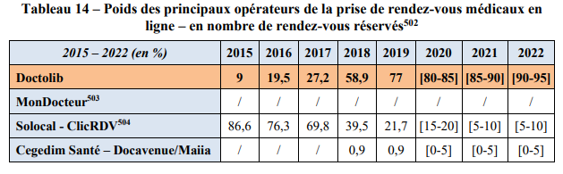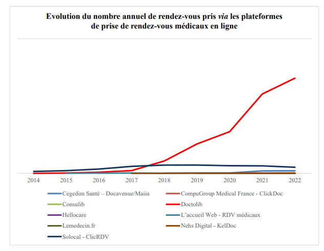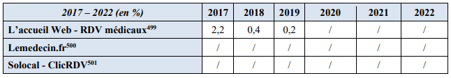 9. Selon une étude de la Direction de la recherche, des études, de l’évaluation et des statistiques (ci-après « Drees ») réalisée auprès de médecins généralistes libéraux et publiée en octobre 2022, l’usage des outils de prise de rendez-vous en ligne est de plus en plus fréquent, plus d’un généraliste sur trois étant utilisateur de ce service en 2022, contre moins d’un sur quatre en 201912.