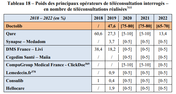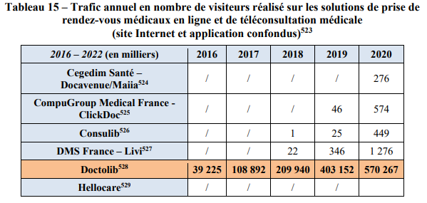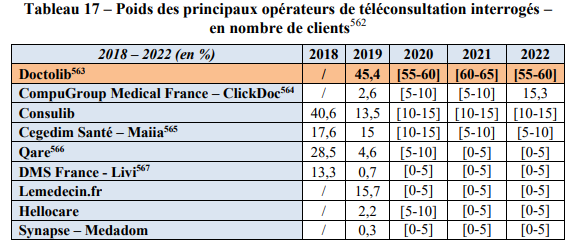 11. Ainsi, la société Lemedecin.fr a déclaré : « [c]ette mise en avant a été un catalyseur colossal avec des communications publiques, des reprises médias importantes, puis également la confiance vis-à-vis des médecins et des patients. On a vu des lettres de la [Caisse nationale de l’Assurance Maladie] qui faisaient la promotion de structure [sic] privées, ce qui a été choquant de mon point de vue. Cela a donné du poids à la confiance client. Cela a tué le marché en mettant en avant certains acteurs et en cristallisant des positions concurrentielles qu’il est difficile d’aller chercher, en raison de la notoriété publique de ces acteurs qui a été poussée par un écosystème »15.