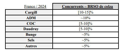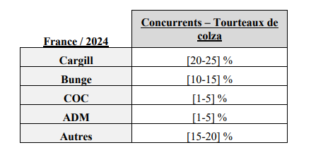 59. Sur le marché français de la production et commercialisation de tourteaux, la nouvelle entité fera face à la concurrence d’acteurs de dimension internationale qui exercent une pression concurrentielle importante sur les différentes familles de tourteaux de colza.