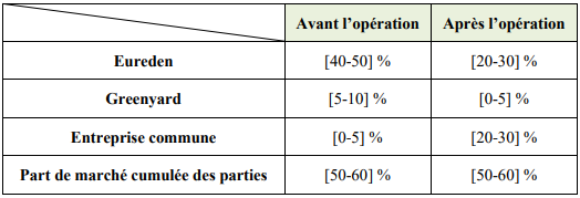 98. Or, sur ce segment de marché, l’entreprise commune disposera d’une part de marché de [30- 40] % ([20-30] % provenant d’Eureden et [10-20] % provenant de Greenyard) et seule Greenyard restera active avec une part de marché de [5-10] %. L’asymétrie de ces parts de marché entre l’entreprise commune et l’une de ses sociétés-mères, sur un marché où la majorité des volumes sont commercialisés par des entreprises concurrentes est de nature à écarter tout risque d’effets coordonnés résultant d’une coordination du comportement concurrentiel des parties.
